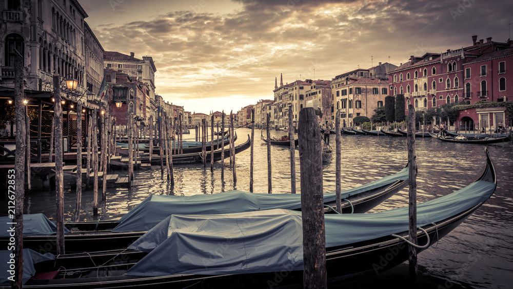 Grand Canal with gondolas at sunset, Venice, Italy