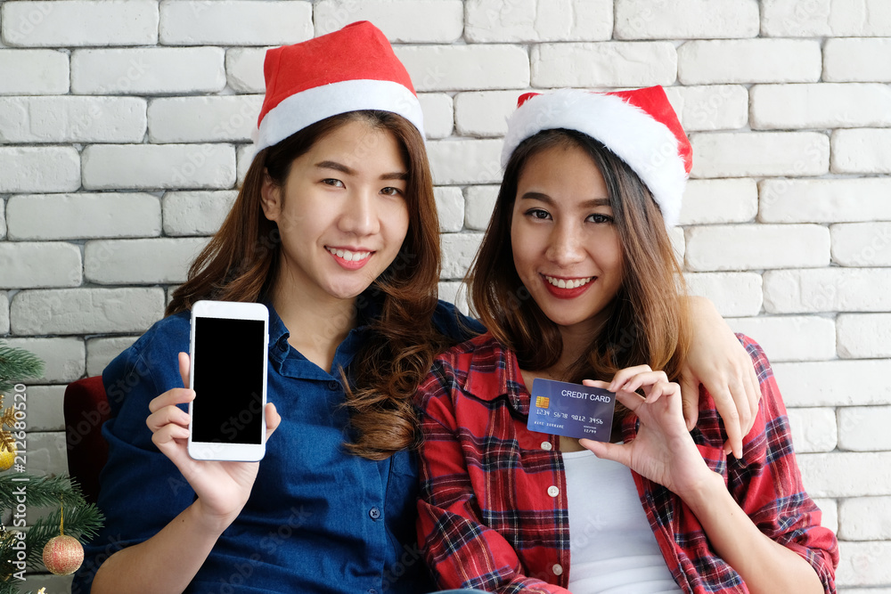 Two young cute asia women holding smartphone with blank screen and credit card for shopping online background,mock up, with happiness, Christmas holiday shopping concept