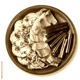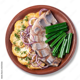 Ceramic dish of red clay on a white background. in a plate fried potatoes, salted pickled herring, green onions and parsley. concept of New Year's snacks on the table.