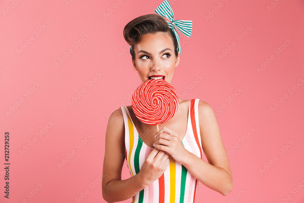 Portrait of a lovely brunette pin-up girl in plaid shirt