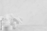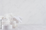 White spa cosmetics products and light bath accessories on white wood background, interior, copy space.
