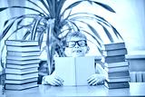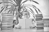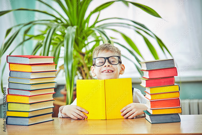 Back to school and happy time! Cute industrious child is sitting at a desk indoors.