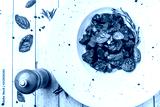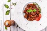The liver of foie gras and juicy beef meat in a spicy tomato sauce with basil and cherry tamata in a chalk plate on a white, angled table. concept of a beautiful serving of food in a restaurant.