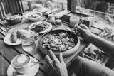View from above on table with fresh breakfast. Man hands holding fork and knife