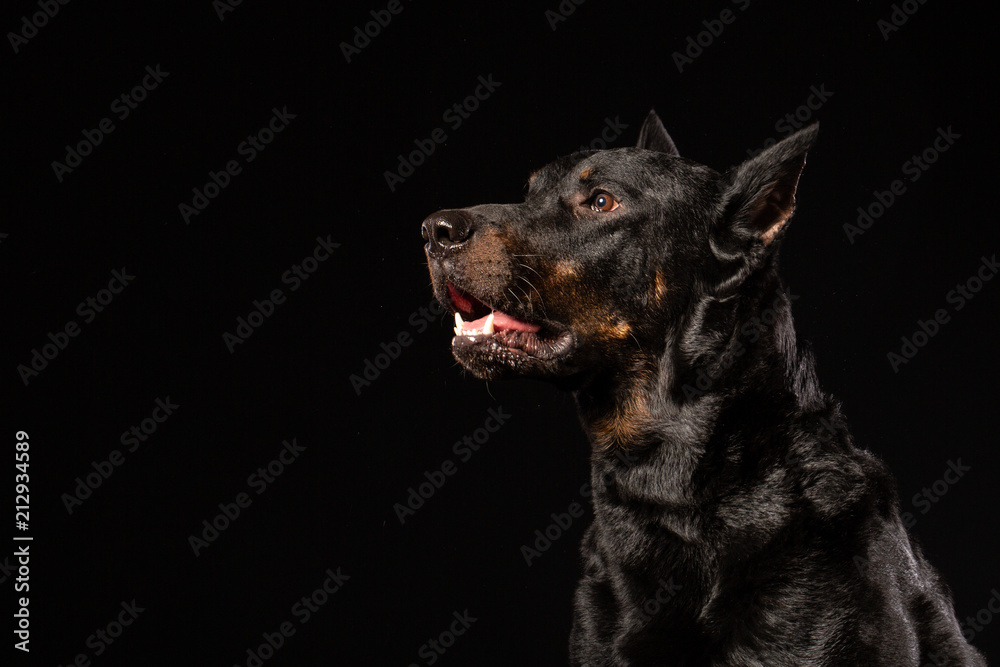 Doberman Pinscher Dog Standing and Looking in front of him on isolated Black background