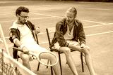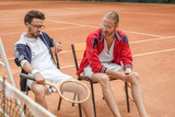 athletic friends with wooden rackets sitting on chairs after training on tennis court