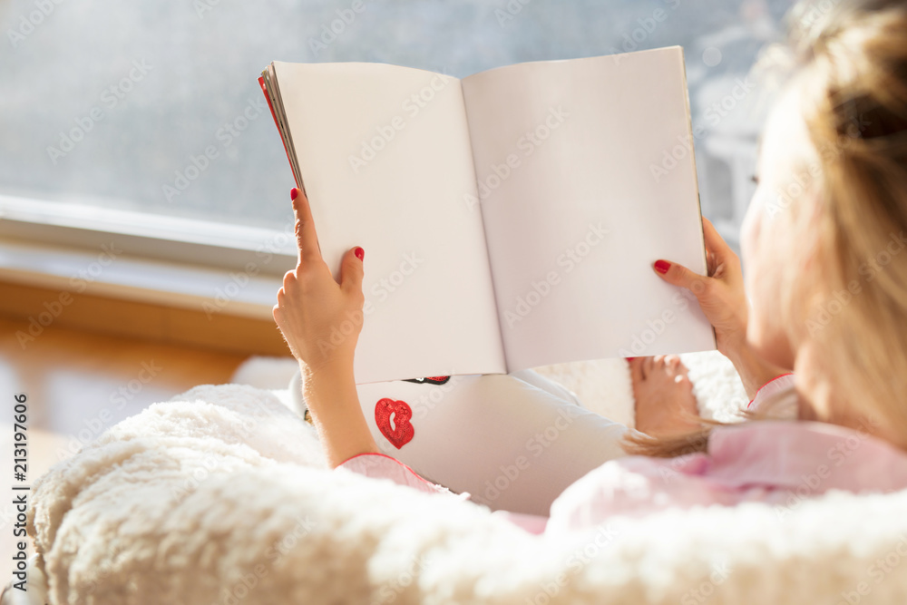 Woman reading magazine with empty white blank pages. Mockup and template for your own content.