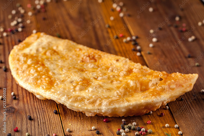 Uzbek eastern Tatar cuisine, cheburek with meat and suluguni cheese in a white plate with vegetables and greens on a wooden table.