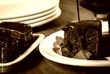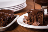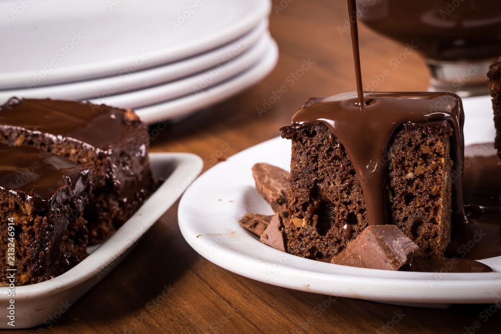 Brownie cim calda escorrendo e pilha de pratos desfocado no fundo numa mesa de madeira