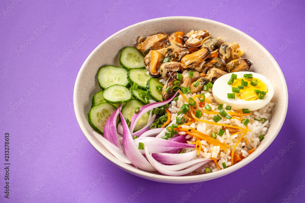 Hawaiian Pake salad with mussels, boiled egg, red onion, cucumber and rice, with black sesame. in a gray plate. On a purple colored trendy background in 2018. copy space, top view