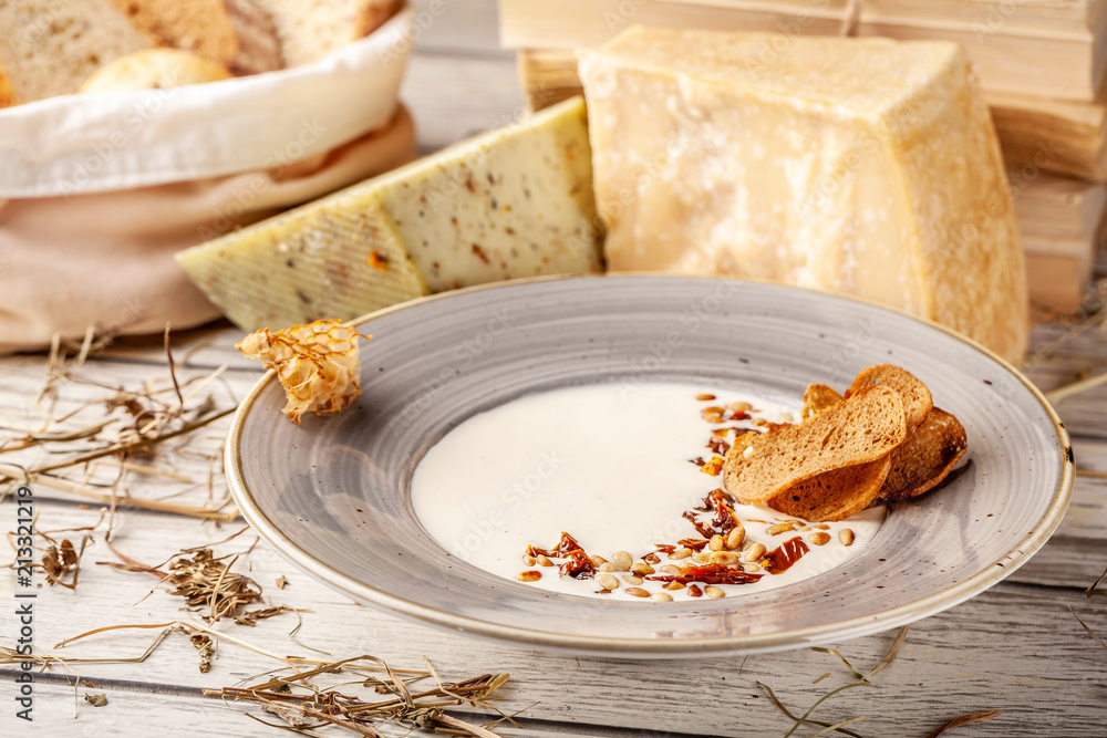 Italian cheese cream soup with dried tomatoes and pine nuts. Next to the table is the head of Parmesan cheese and Dor-blue, on a white wooden table.