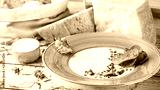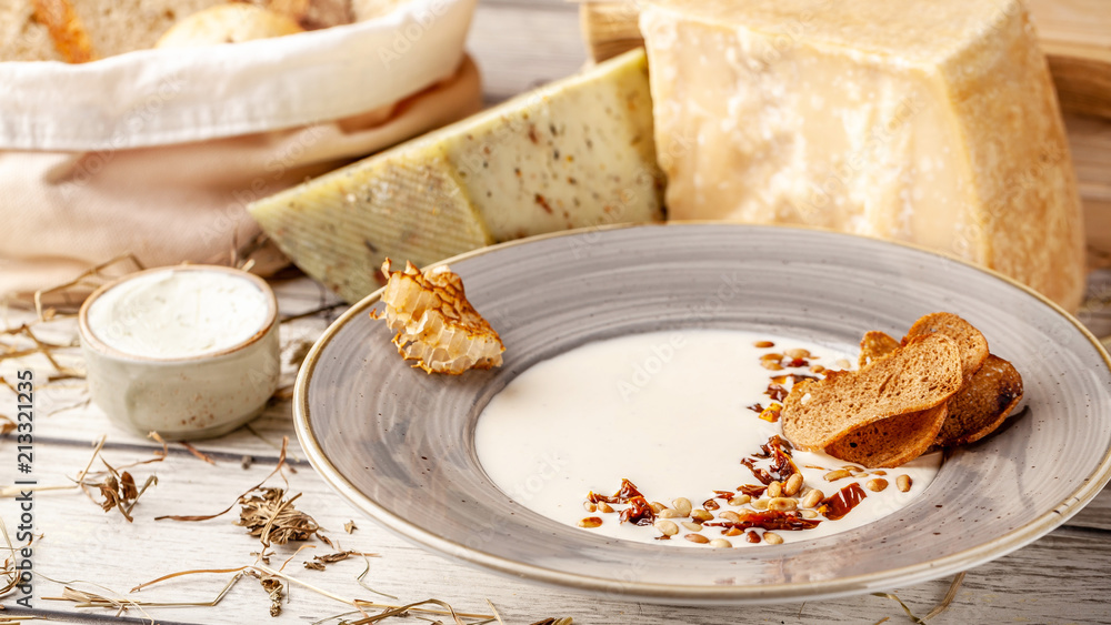 Italian cheese cream soup with dried tomatoes and pine nuts. Next to the table is the head of Parmesan cheese and Dor-blue, on a white wooden table.