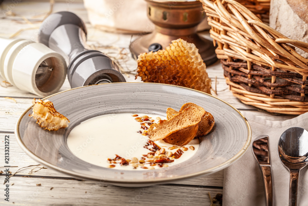 Italian cheese cream soup with dried tomatoes and pine nuts. Next to the table is the head of Parmesan cheese and Dor-blue, on a white wooden table.