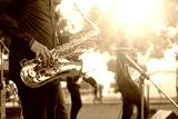 World Jazz festival. Saxophone, music instrument played by saxophonist player and band musicians on stage in fest.