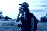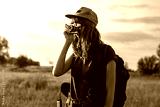 Young female tourist taking photo at hiking trip. Woman with backpack stands at sunset and photographs beautiful rural area