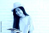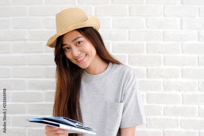 Young asian woman traveler holding map and smiling in white room with copy space, people summer holiday vacation background concept