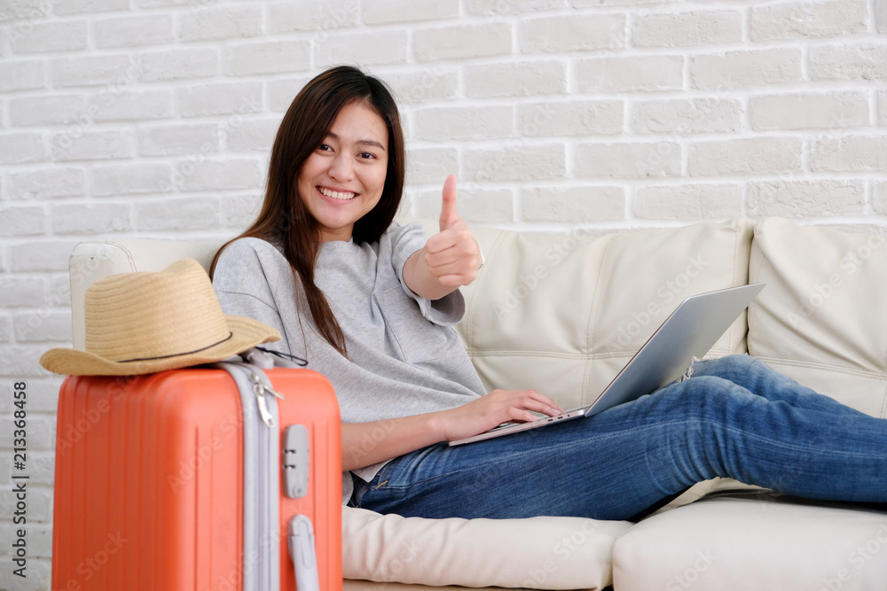 Young asian woman traveler using laptop and smiling with ok guster hand sign, blogger, travel summer holiday vacation concept