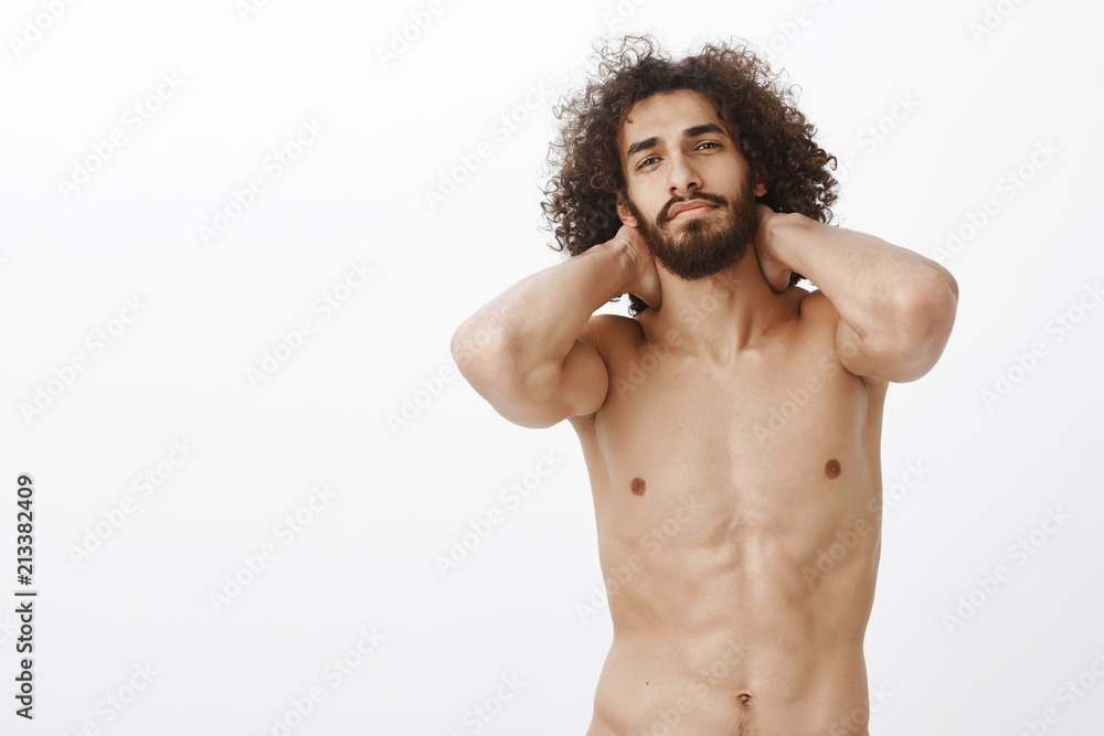 Good-looking confident macho man with beard and curly hair, standing with naked chest over gray background, holding hands behind neck, staring self-assured at camera, posing for advertisement