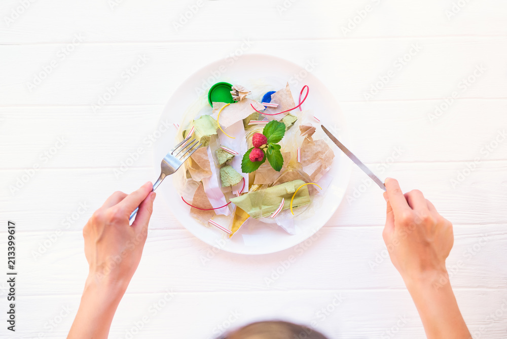 Top view female hands holding knife and fork over the plate with unreal salad from recycle waste, synthetic ingredients. Concept of artificial, food. GMO, E numbers . Chemicals in the food industry.