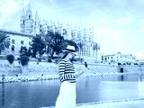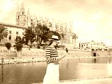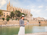 Stylish, beautiful woman on the background of palm trees, river and historical buildings. Spain, Palma de Mallorca