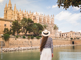 Stylish, beautiful woman on the background of palm trees, river and historical buildings. Spain, Palma de Mallorca