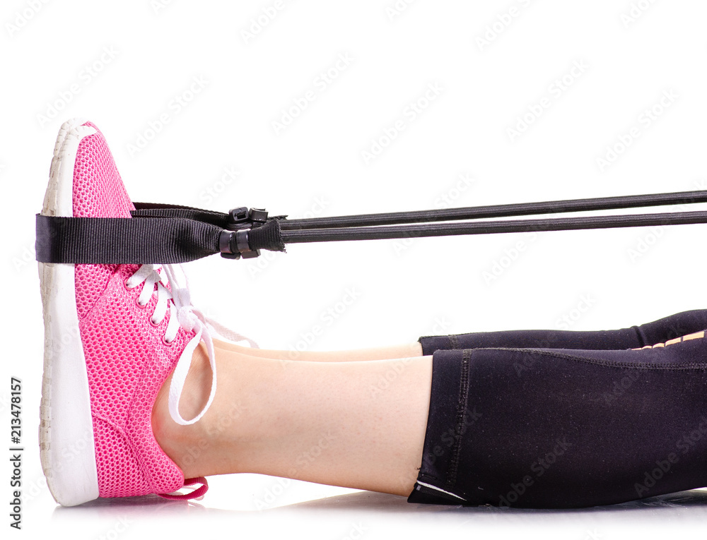 Female legs sports leggings sneakers sports exercises expander for legs on white background isolation