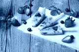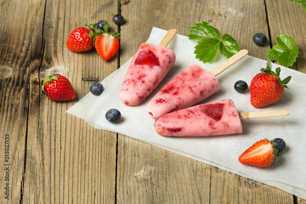 Świeże domowej roboty lody truskawkowe na patyku na drewnianym tle.