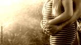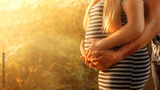 Close up portrait of happy pregnant woman in white-black dress together with husband hugging at sunset