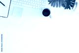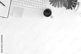 Office desk with computer, pencil, notepaper and headphones with coffee on workspace top view.