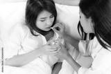 Charming beautiful woman gets ill or sick. Lovely girl gets headache. Her beautiful sister is giving and entering medicine or pill to her younger sister or friend. She gets sick leave of work today