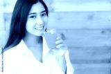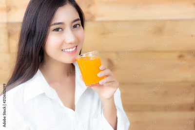Attractive beautiful asian woman is drinking orange juice. Charming beautiful girl hold a glass, smiley face. Orange juice is enriched of high vitamin c. It’s good for skin, healthy. She feel happy