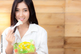 Charming beautiful woman is using a fork for getting vegetable to put in her mouth. Attractive beautiful girl love to eat healthy food. Pretty woman wants to diet. Vegetables, salad is good for health