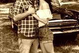 embrace.Love and affection between a young couple at the park, near the old car. a guy in a plaid plane and jeans, a girl in shorts and a white jacket. They get together in the forest for a walk.