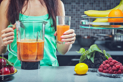 Fruits leaves and vegetables on blurry background.