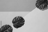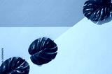 Creative layout made of tropical leaves on pastel pink and blue background. Minimal summer exotic concept with copy space.