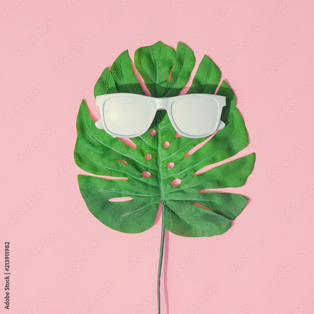 Creative tropical summer layout made of monstera leaf and painted sunglasses. Flat lay. Minimal concept.
