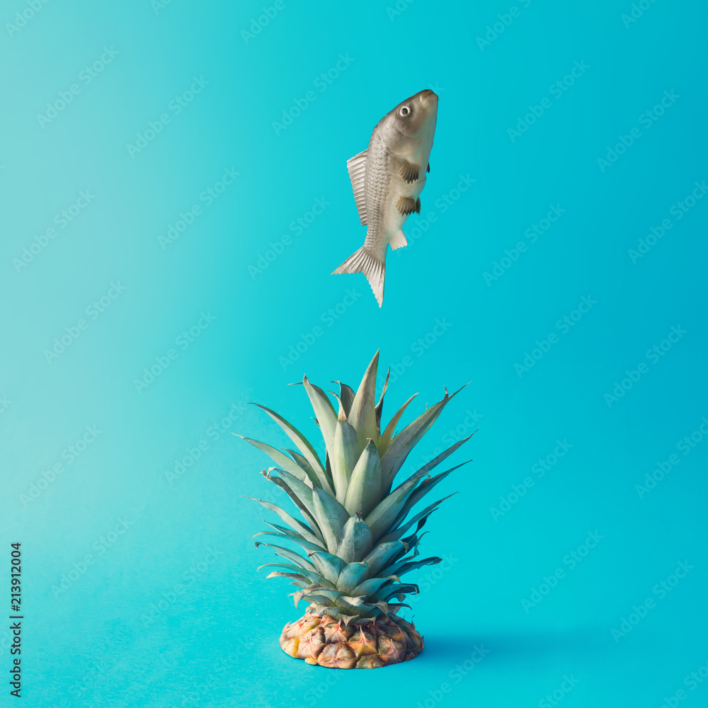 Fish jumping out of of water. Pineapple splash. Creative minimal food concept.