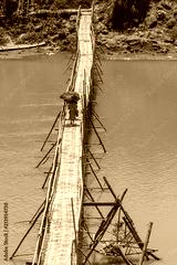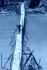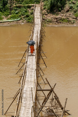 Buddhist monks cross the Nam Khan river on a bamboo bridge, protecting themselves from the sun with umbrellas at Luang Prabang, Laos