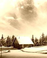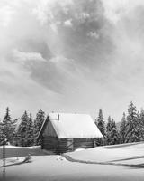 Fantastic winter landscape with wooden house in snowy mountains. Christmas holiday concept. Carpathians mountain, Ukraine, Europe