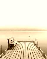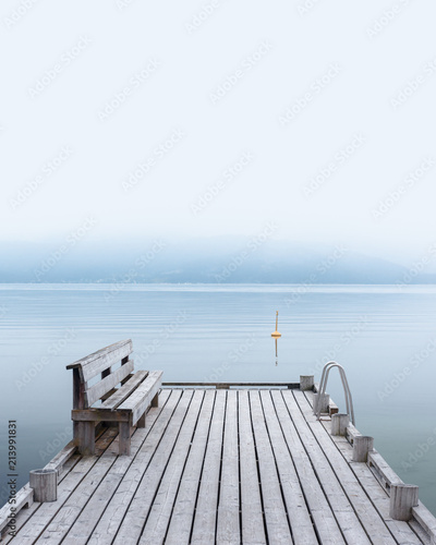 Misty morning on Norheimsund village. Wooden pier on hardangerfjord, Norway, Europe
