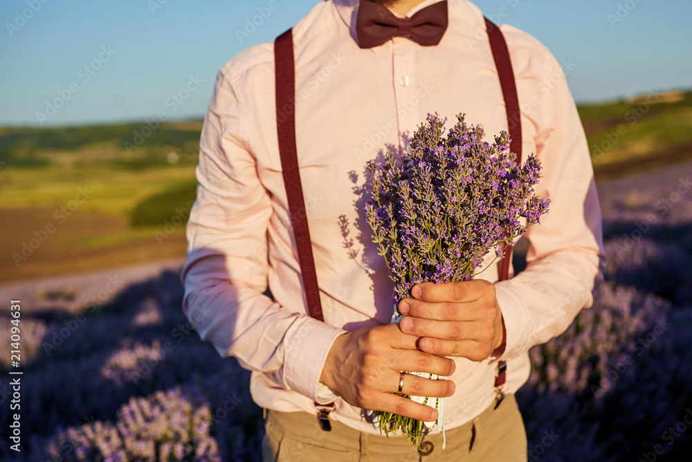 Close-up of a bouquet of lavender in the hands of the groom in the field of lavender.