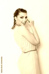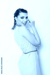 Attractive young blonde woman in beige boho dress with belted waistline, smiling and posing against white wall. No retouch, studio lighting
