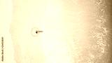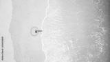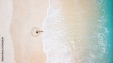 Aerial view of young woman in blue bikini making sand angel. Hot beach with cool waves. Summer and holiday concept, seascape with girl, beach, beautiful waves, blue water. Top view from drone shot.