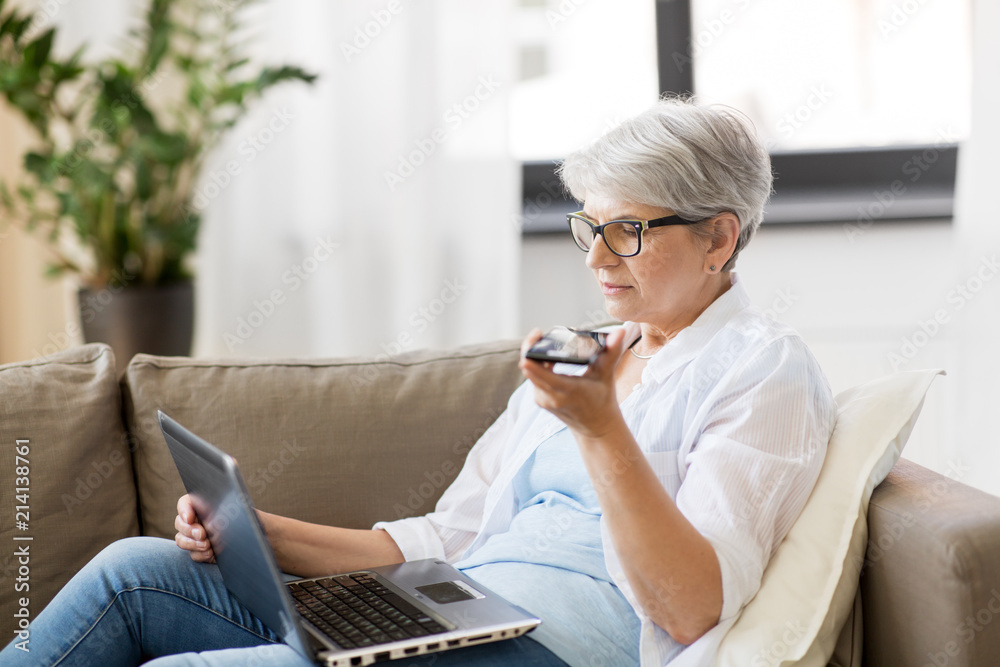 technology, old age and people concept - happy senior woman in glasses with laptop computer and smartphone using voice command recorder at home