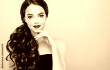Beautiful model girl with curly brown hair . Brunette woman with wavy hairstyle . Red lips ,dress and nails manicure . Fashion , beauty and make up portrait