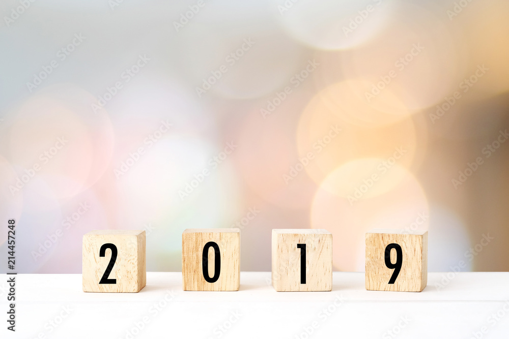 2019 new year greeting card template, 2018 on wooden cubes on white table and white cement wall background, banner with copy space for text