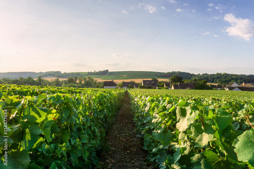 Row vine grape in champagne vineyards at montagne de reims countryside village background, France
