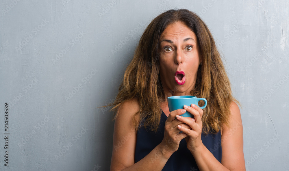 Middle age hispanic woman standing over grey grunge wall drinking cup of coffee scared in shock with a surprise face, afraid and excited with fear expression