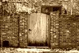 Rustic wooden arched garden fence in brick wall in autumn with colored leaves and brick house with colorful fall foliage reflected in windows