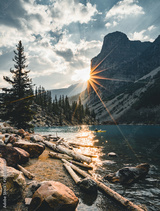 Sunrise with turquoise waters of the Moraine lake with sin lit rocky mountains in Banff National Park of Canada in Valley of the ten peaks.